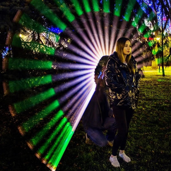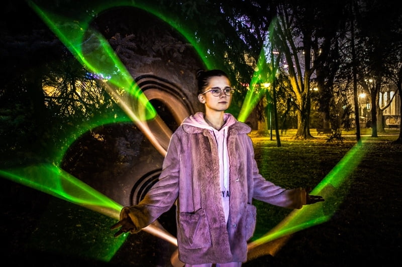 Okazało się, że sztuczne światło wieczornego miasta jest zbyt mocne, żeby osiągnąć zamierzony efekt. Dlatego skierowaliśmy się w bardziej osłonięte miejsce gdzie nasz light painting nabrał kolorów. Praca była zespołowa, mieliśmy doskonałe modelki, modeli, oświetleniowca, operatora miecza, szefa planu i jeszcze kilka nieobsadzonych etatów. Ci, którym nie udało się zarejestrować w pierwszym dniu zdjęciowym zadowalających efektów, meli szansę powtórki następnego dnia w studio.