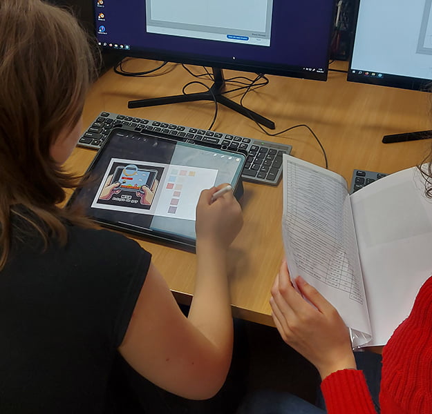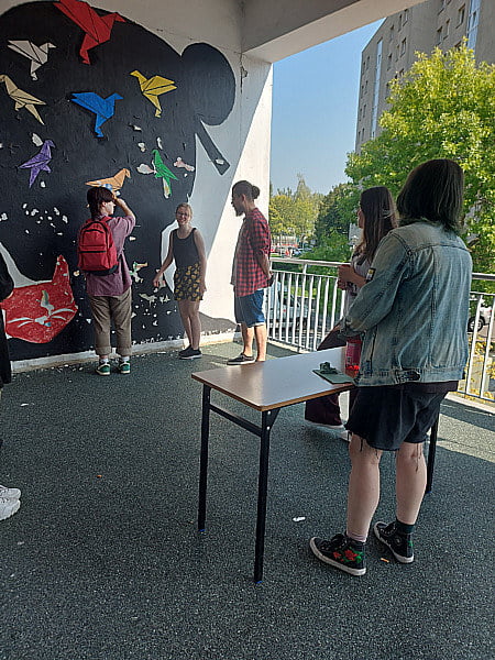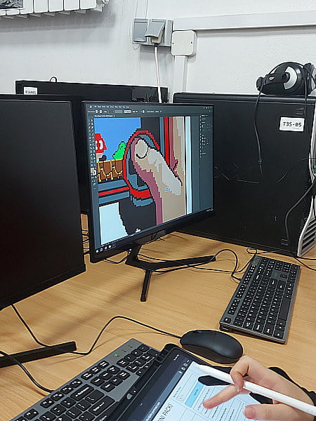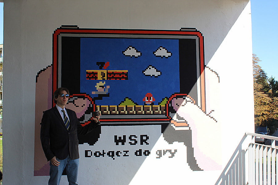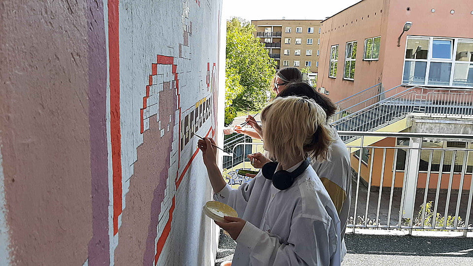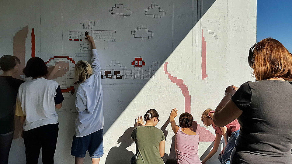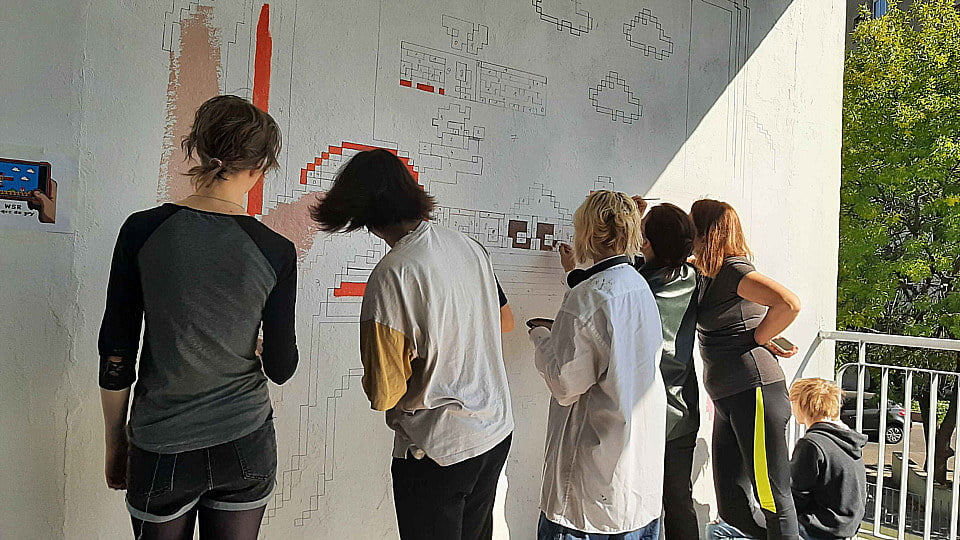 Pod czujnym okiem Andrzeja Sągina oraz Grzegorza Rusinka (który odpowiadał za projekt graficzny pracy), nasi słuchacze wspólnie stworzyli nowy mural, który będzie od teraz zdobić jedną z zewnętrznych ścian naszej placówki. Mural nawiązuje do tematyki klasycznych gier wideo i został wykonany w stylu pixel art – na pewno przykuje uwagę każdego fana retro estetyki!