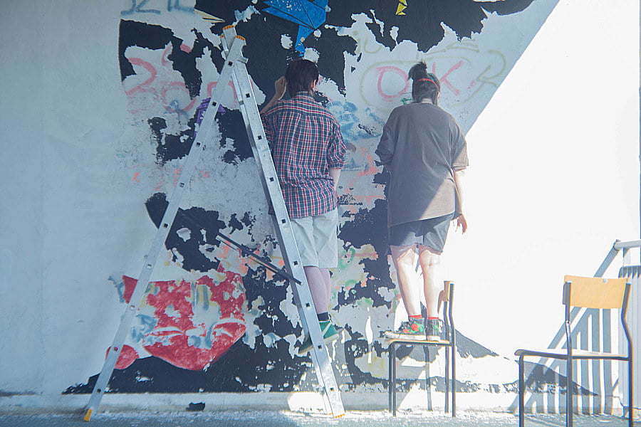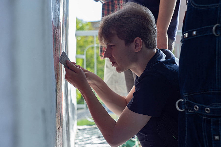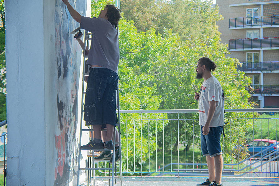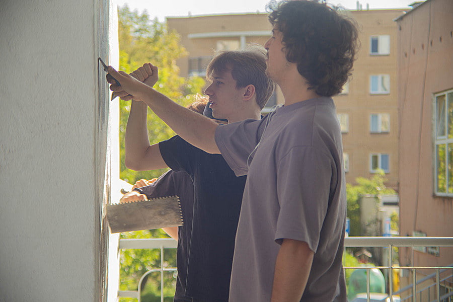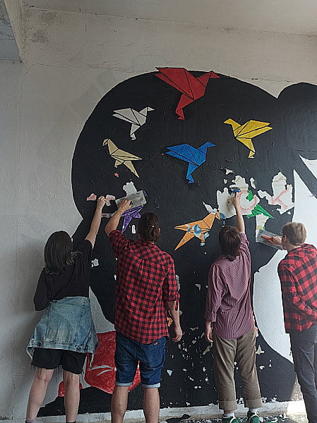 Zadanie nie było proste, ale dzięki doskonałej współpracy, słuchacze dzienni oraz zaoczni zrealizowali ten projekt w wielkim stylu. Ucząc się odpowiedniej pracy w grupach nasi słuchacze najpierw podzielili się na grupy, przygotowali powierzchnię ściany, zakupili wszystkie potrzebne narzędzia oraz farby, a potem krok po kroku nanieśli na nią wzór muralu.