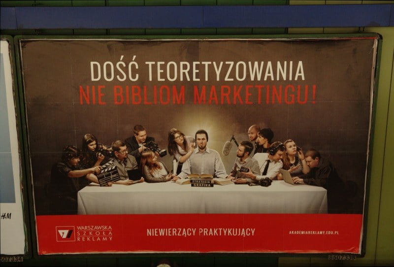 Jeszcze przed świętami Wielkanocnymi rozpoczęliśmy nową kampanię, która nawiązuje do słynnego obrazu Leonarda da Vinci, przedstawiającego Ostatnią Wieczerzę. Na środku stołu, przy stercie podręczników zasiadł zakłopotany student, a wokół niego zgromadzili się uczniowie wraz z praktycznym sprzętem, z którym na co dzień mają do czynienia w szkole. Kampanii towarzyszą hasła przewodnie “Niewierzący - Praktykujący” oraz “Dość teoretyzowania, nie bibliom marketingu!”. Za kreację odpowiada agencja kreatywna SlowArt.